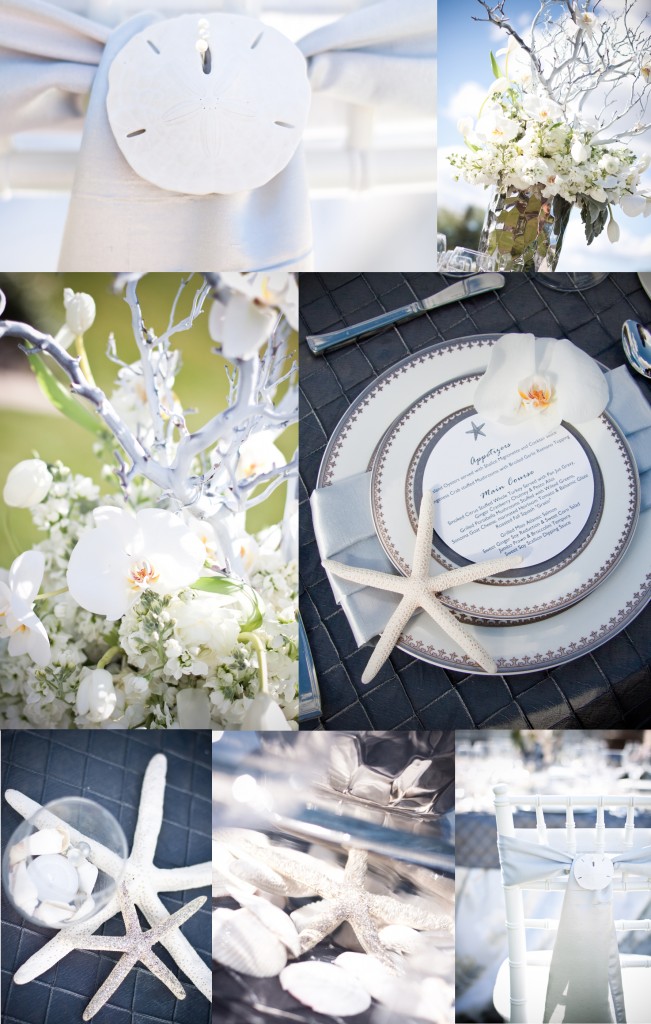 I started out by purchasing the centerpiece vase at a local outlet ~ It was a perfect fit with its rippled water-like finish to it. And then it was onto the flowers! Audrey from Botanica Floral Designs and I were on the same page when it came to the centerpiece construction. We wanted to do something that gave the look of coral, for which we chose white manzanita. We then added some elegance to it with white orchids and other very fresh feeling flowers, which reminded me of the crisp ocean air.