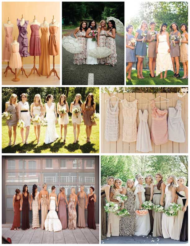 Today’s fun, stylish and daring brides are choosing mix matched dresses and an array of colors, and fun patterns.One of my personal favorite trends is mixing and matching. To achieve this look (without clashing) first pick an overall color scheme. For example, if you are having a vintage inspired wedding, pick blushes, ivories, and greys. If you are a brave bride (and have confidence in your girls) ask them to start their search for an appropriate length dress that is in the your color scheme, try it on, and send you a picture. This allows each girl a comfortable amount of time to find that perfect dress and it saves you time and the headache of running from store to store to find several different dresses.