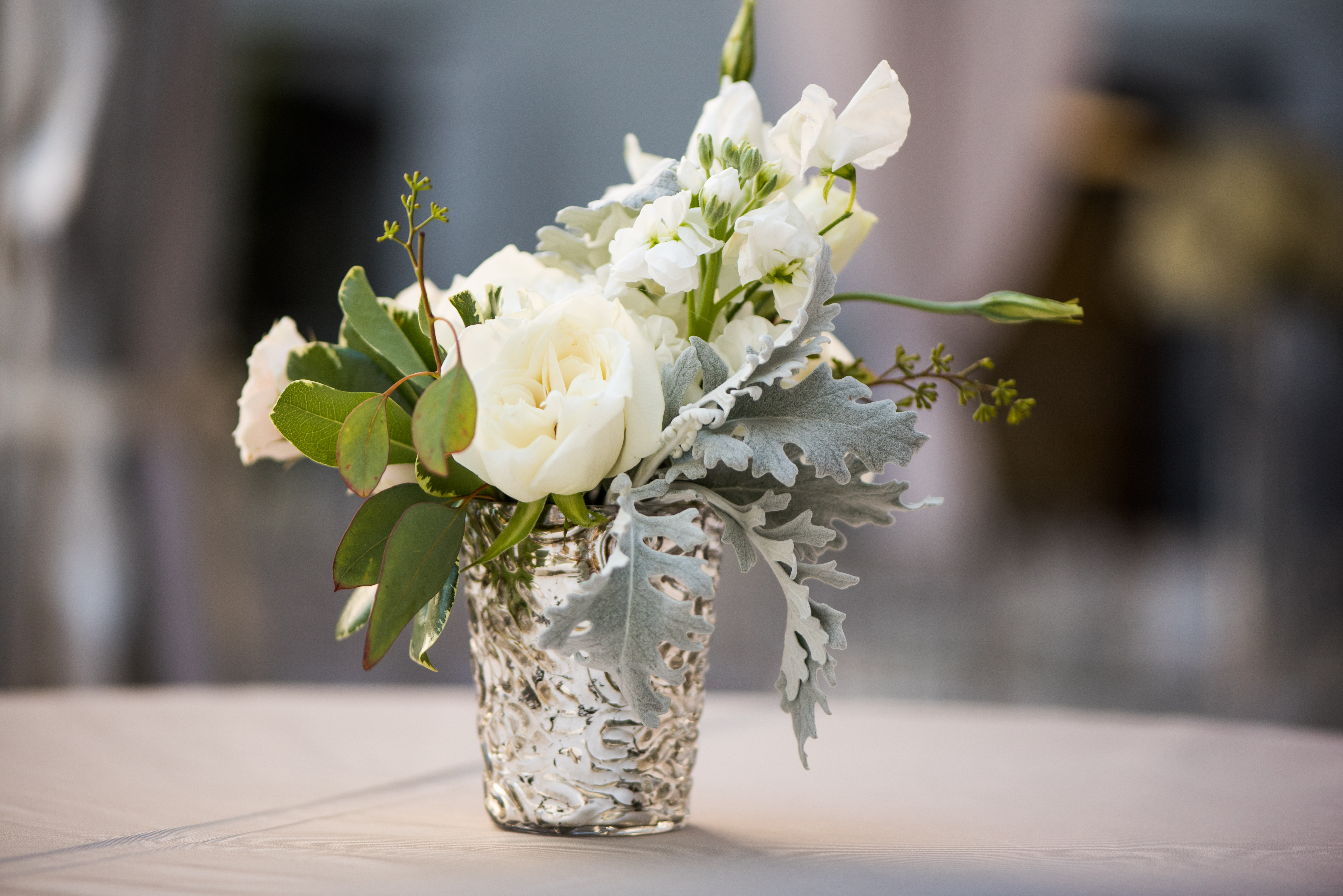 The design for their day included a custom tent that we constructed in the courtyard of The Crocker. We accented the tent design with fabric, chandeliers and lighting to create a warm and glamorous feeling for their guests to enjoy. The tabletops were then layered with pops of mint and blush and accents of mercury glass and metallic silver elements. To finish off the overall design, we brought in rented olive trees to warm up the courtyard and add a little bit of a garden feel. And, then there was the cake…I won’t spoil it for you, but I highly suggest that you scroll down and take a peek at the images by my dear friend Jessica of Stout Photography.