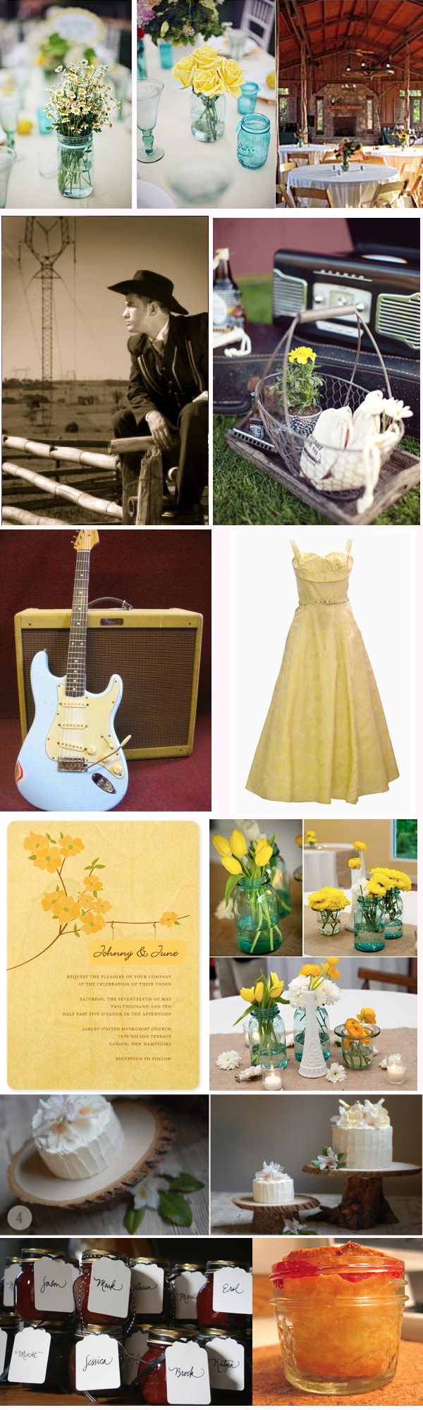 The inspiration board below is based on one of my favorite icons, one of my favorite movies and my husband’s sweet thoughts of our pending celebrations. I would have loved to have seen June wearing yellow {although she looked good in just about anything}. I was also drawn to wildflowers, woodsy accents that remind me of Tennessee, vintage guitars, home made jams and pie ~ and one smokin’ hot cowboy! Enjoy y’all!