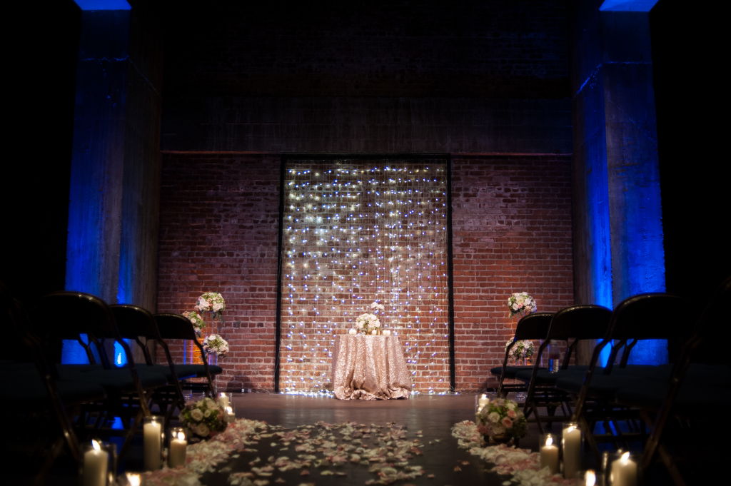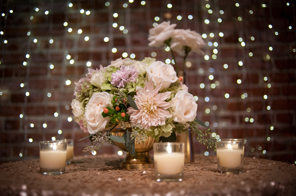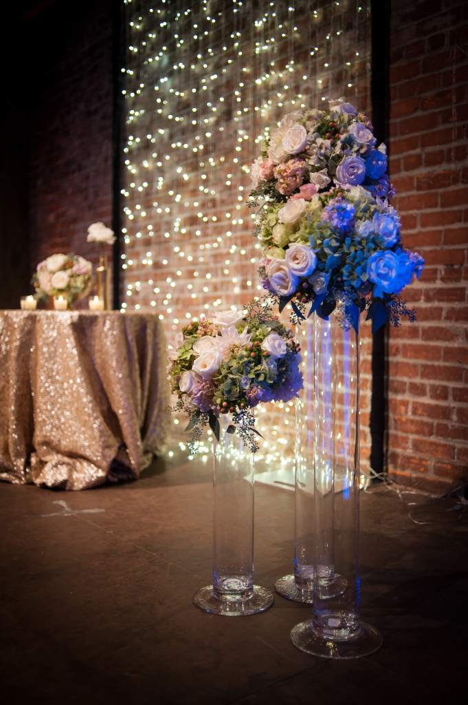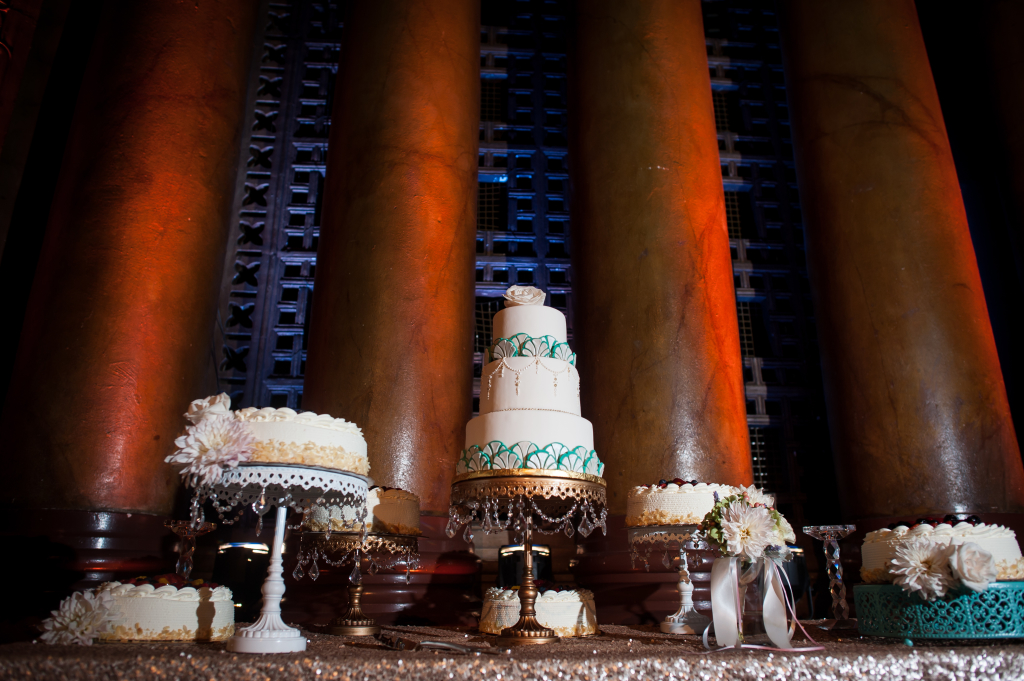 I began working with Fonda and Nick several months before their wedding and, together, we created a perfectly beautiful design that fit this couple to a T. I love that Fonda made it a priority to work with the art deco style of her venue, yet still kept her own distinct style intact. She had envisioned a palette of soft pinks and bold blues – a little bit soft and a little bit dramatic. Once we added in the perfect lighting elements, the finest details and an abundance of candle light, it was an amazing scene.